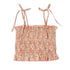 Sweet floral print smocked top. Features fixed shoulder straps with tied bow detail, ruffle trim along top and hem.