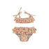 Adorable mini hearts print bikini featuring adjustable ties straps, ruffle layer on top and two rows of ruffles on the bikini bottom.