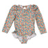 Beautiful multicolor floral print long sleeve. Features a keyole opening at back with tie closure, ruffle trimmed legs and a slight puff to the shoulder.