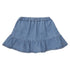 Mini blue jean skirt with a gathered, elasticized waist and bottom ruffle. Depending on height skirt falls around mid thigh.