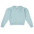 Soft cable knit sweater. Features rounded collar with keyhole button closure, ribbed cuffs and hem in a pretty blue-green.