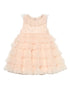 Pretty tiered dress with a tulle ruffle trimmed neckline. Features sequins, crystals and pearls delicately cascading across the bodice. A timeless piece for fancy occasions.