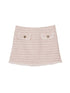 Fashionable boucle skirt. Fully lined skirt features silver lurex threads throughout, faux front pockets with gold heart buttons and pearl-look beaded trim. Zip closure in the back. Pair with this shirt for a pulled together look.