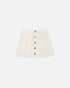 This versatile denim skirt channels preppy charm with antique brass buttons and front patch pockets accented by contrast embroidered stitching.