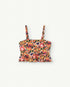 Sweet cropped floral top. Features thin straps, ruffle peplum hem, three button closure at back and allover vintage inspired flower print.