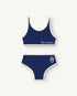 Sporty deep blue bikini with white trim. Features scoop neck and back, contrasting trim and white lettering and logo. Provides SPF 50+ for added protection.