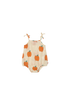 Cute baby romper with an all over apples print on a cream with a hint of peach background.Features fixed tie strap shoulders and buttons between the legs.