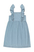 Feminine dress featuring soft striped denim material. Ruffle trim extends from the front, over the shoulder and down back. Features gathered waist and buttons at back for easy dressing.