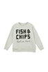 Pale green sweatshirt featuring textured "Fish & Chips" appliqué on front.