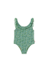 Sweet floral printed one piece with ruffle trim along the front and scoop back.
