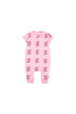 Pink short sleeve jumper with adorable all over print that says "Hey you." Features button snaps at front and at bottom for easy dressing.