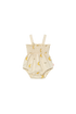 Sweet cream colored romper with all over moons print in yellow. Features a smocked top, fixed length straps and button snaps between the legs for easy dressing.