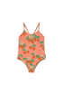 Cute peachy pink swimsuit with all over strawberries print. Features a classic cut and cross back straps.
