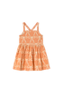 Adorable "swim" dress in a pretty peachy color with an all over bows print. Features cross back straps and a gathered waist.