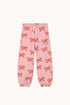 Pink cozy sweatpants. Features elasticized waistband, functional drawstring, playful all over print of smiley earth worms in a bow shape pattern, "TINY" logo on left thigh and gathered cuffs at ankle. Fleece interior for extra warmth.