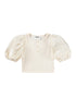 Gorgeous ivory top in a soft and stretchy ribbed cotton with puff sleeves. Features button placket on the front and short length that falls at the waist or cropped depending on height.