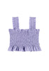 Pretty cropped tank in a lilac color. Features a smocked bodice, ruffle hemline and tank straps.
