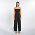 Chic strapless jumpsuit in black with gold thread accents on sides. Features a smocked top, pockets, wide leg cut and side slits that open halfway up the outside of the leg. Made of 95% Polyester, 5% Elastane Cotton. Made in Colombia.