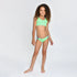 Bright mint green bikini with a soft wavy ribbed texture and comfortable flat lining beneath. Features multicolor straps on the bottom sides as well as on the shoulder straps where it meets in the back in a beautiful macrame flower design.