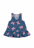 Sweet sleeveless dress in a durable denim quality with a v-neck and flared skirt. Features an adorable all over bows print.