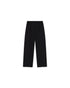 Crushed cotton, polyester pants in black. Long cut with wide dart details and adjustable elastic inner waistband with zip and button fasteners. Turn up detail on bottom of legs and side pockets.