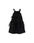 Beautiful crushed cotton polyester black sun dress with straps. Features a mid-length design, two side pockets, raw hems and tulle ruffle tiers.