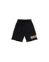 Cool black Bermuda style shorts in 100% brushed cotton. Featuring a wide cut, concealed elastic waistband, two side pockets and raw hem finish. Ohana is printed in laminated gold around the bottom of the left leg.