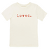 Gender neutral design with text in red "loved.". Made from buttery soft and breathable premium organic cotton.