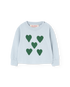 Light blue sweatshirt whimsical hearts in green. Features a button snap on the left of the neck for easy dressing.