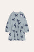 Cute and comfy long sleeve dress in a dusty blue with true blue all over ribbons print. Features a cute round the campamento patch at left chest, rounded neck, keyhole opening at back with button closure, gathered waist, elasticized cuffs and lightweight, worn-in feel sweatshirt material. Made in Portugal of 100% cotton.