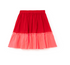 Bright and playful mini skirt in red with neon pink bottom ruffle. Features an. elasticized waist, raw edge hemline and a full cut with lots of twirl factor.