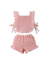 Pretty two piece set in pink. Smocked top features tank straps, side ties, and ruffle trim in a swiss dot pattern. Smocked shorts feature elasticized waistband and ruffle trim on the hem in swiss dot pattern.
