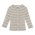 Soft and stretchy grey knit ribbed cardigan with narrow off-white horizontal stripes. Features a rounded neck and grey buttons down the front. Pair withthe matching bottoms for a luxe gift.