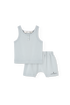 A breezy, minimalist set in a soft blue color. Two piece set features a tank top and matching shorts.