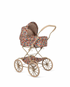 Vintage style doll pram designed with four large wheels. Features quilted fabric, delicate scallop edges, and a padded mattress. Designed with a softly cushioned storage basket under the lift. The frame is made of metal with spongy soft handles for easy grip.