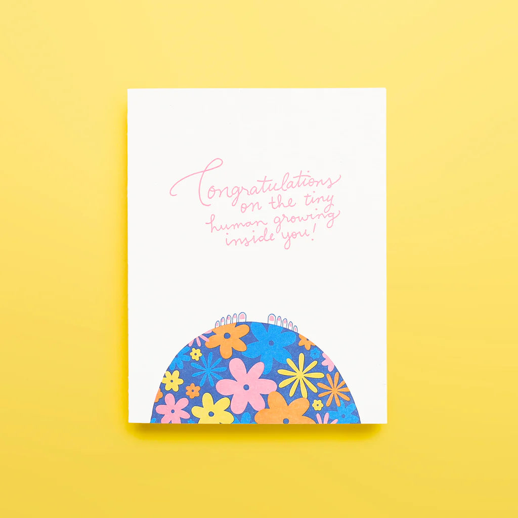 Letterpress printed by hand. 100% cotton paper (no trees!). Hand-mixed inks. Card measures 5.5 x 4.25 when folded, blank on the inside. Comes with a cute little pink envelope.