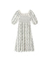 Beautiful floral midi length dress featuring a smocked bodice and mid length sleeves, with intricate crochet trim along the front and back of the neck.