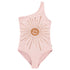 Pretty one shoulder swimsuit with a gorgeous embroidered smiling sun design on the front.