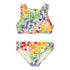 Gorgeous bikini in colorful flowers print. Top features ruffle trim along the outer edge of sides, chic cut out open back and two gold clasp closures. Classic bikini bottom.