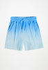 Knee-length terry shorts in an ombre light blue to teal blue shade. The shorts have a loose fit, elastic waistband with drawstring, side pockets, and a back pocket. The soft cotton terry dries quickly and is ideal for the beach or pool. Made of 100% organic cotton.