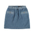Chic blue short bouclé denim skirt. The skirt has pockets at the front, an elastic waist and an invisible zipper at the front to make it easy to put on.