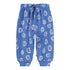 Cute & cozy pants in blue with a print of white faces in different moods. Features an elastic, drawstring waist and ribbed cuffs at the ankles. Made of organic cotton.