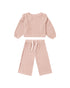 Pretty "rose" pink soft textured two piece set. Features a long sleeve top with ruffle details at the shoulders and a matching straight leg drawstring pant.