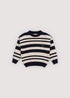 Gorgeous knit sweatshirt in off white and navy stripes in variable widths. Features contrast mustard/old gold colored embroidery at lft chest.