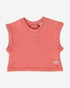 Boxy cut sweatshirt tank with a cute heart shell patch at the bottom left. Features rounded neck, rolled cuff arm holes and snap closure at back .