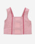 Pretty gingham top in a purple "sangria" and cream checked pattern. Features tank straps, a decorative ric rac trim on both sides and a pretty open back with two horizontal straps that close with a button.