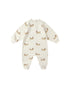 Long sleeve french terry jumper with an all over Christmas Dogs print. Features elastic leg openings, a roomy fit, snap buttons at back and button snap closures between the legs for easy changing.