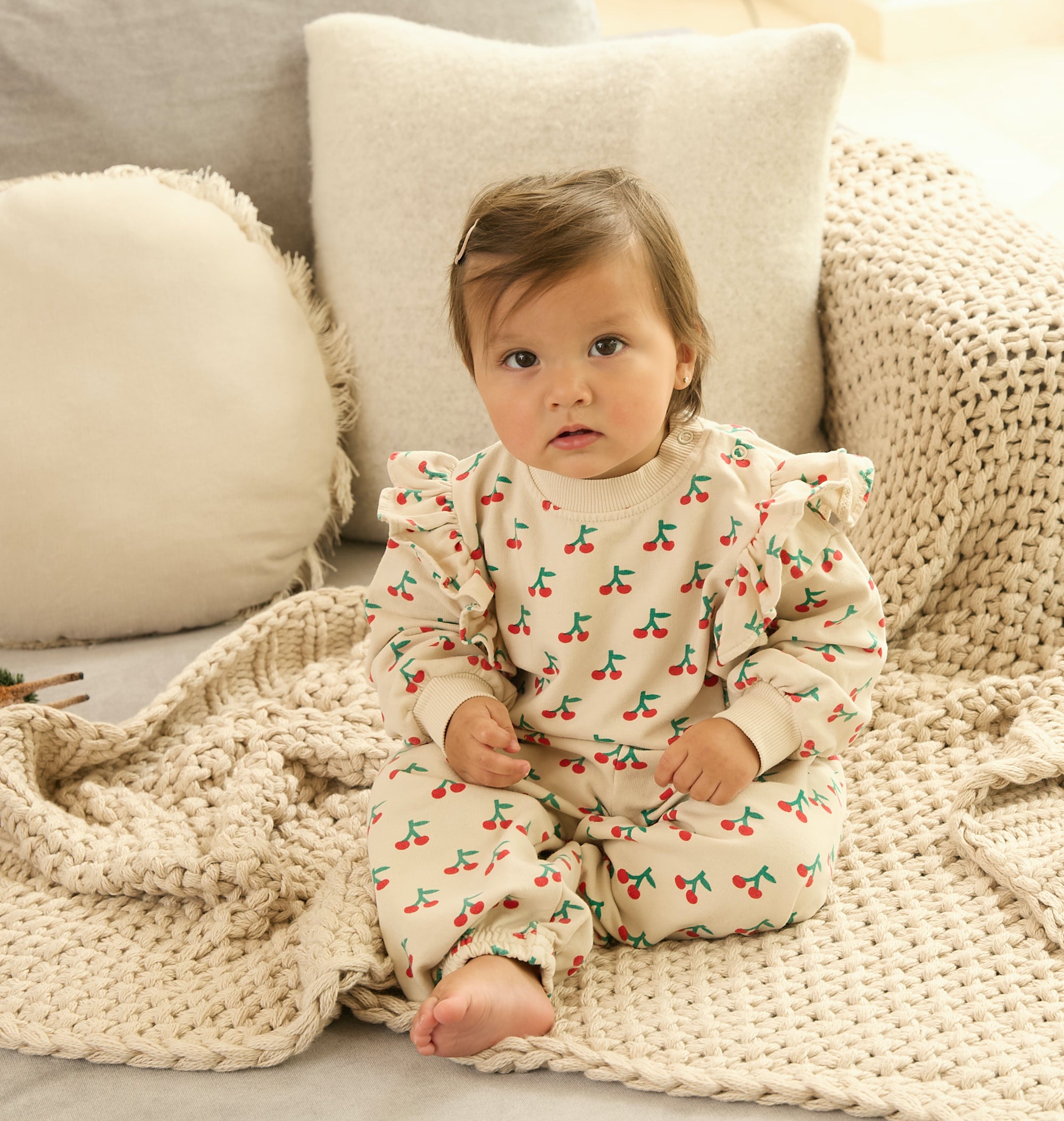 Sweet all over cherry printed sweatpants in a roomy fit. Pair with the matching sweatshirt for an adorable set>