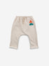 Loose fit harem style pants featuring an elasticized waist, natural colored drawstring and a tapered leg. these solid pants have a cute "funny friends" design made up of geometric shapes with a cute face which is place on the left hip. Pair with the matching top for a sweet set.