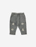 Deep grey baby jogging pants featuring and elasticized waist, two side pockets and scattered letters "BOBO" on the legs.
